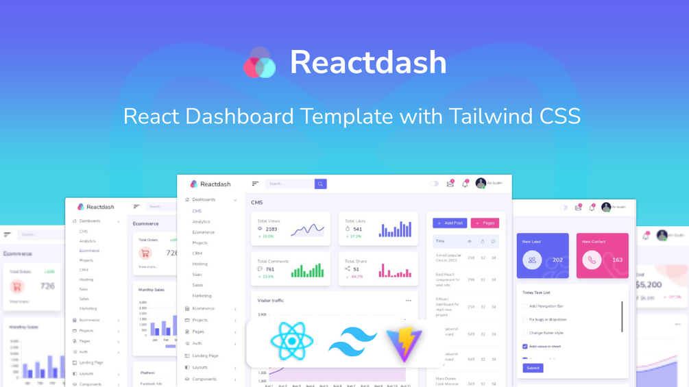 Reactdash is a React dashboard admin template with UI components built with Tailwind CSS & React Js. Makes it easy for developers to create React dashboards with a clean and modern look.