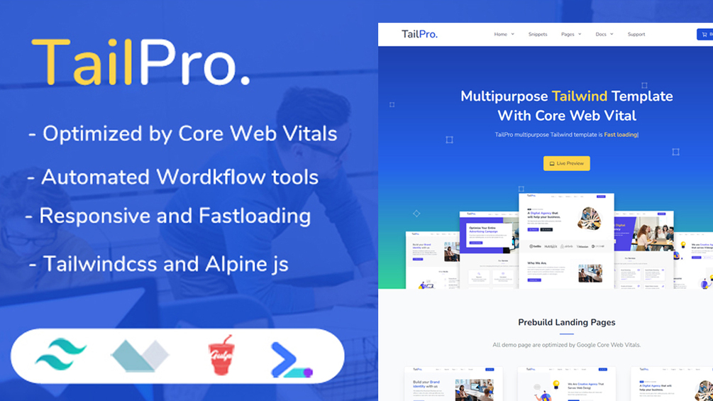 Tailpro is a modern Tailwind CSS template optimized with Google Core Web Vital features, ensuring blazing-fast performance and top-notch SEO rankings. Tailpro integrates tools like Gulp, Browsersync, and others for an automated workflow. It's easy to customize styles directly from the HTML file, providing flexibility and convenience for developers.